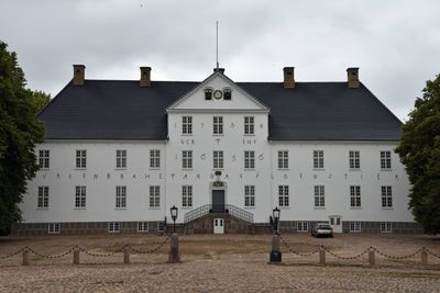 Brahesborg Manor stands on Funen island, featuring white walls and traditional Danish architectural elements with symmetrical window arrangements.