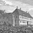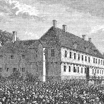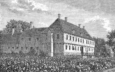 The three-winged manor house stands on a bank encircled by a moat, with granite boulders forming the foundation of its steep slopes.