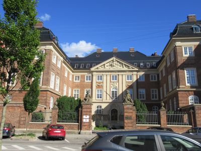 The Neo-Baroque building features a three-winged structure, three storeys, and a Mansard roof covered with black-glazed tiles at Kristianiagade street.
