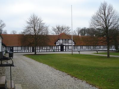 The main building of Kalø Hovedgård stands in three wings, constructed with timber framing and surrounded by agricultural structures from the 1700s.
