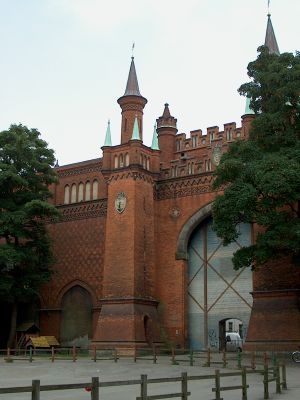 The Shooting Range Wall stretches along Skydebanehaven park with its neo-Gothic design, featuring red brick construction, pinnacles, and decorative elements.