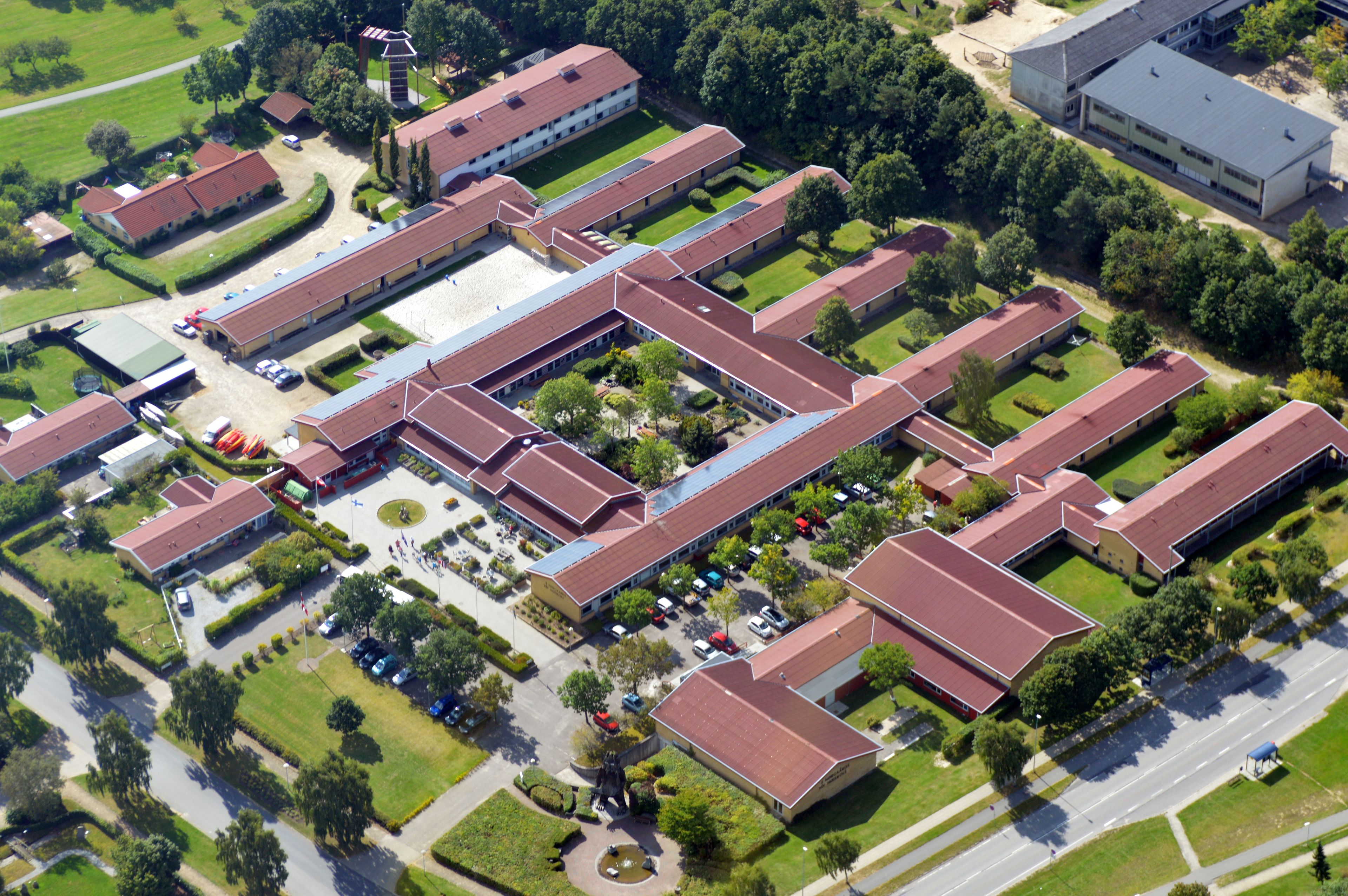 Nørgaards Højskole features multiple teaching spaces, dormitories, a swimming pool, fitness room, gymnasium, student café, and cinema within its educational complex.