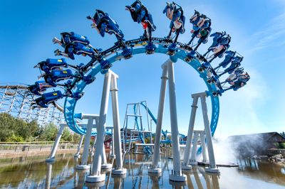 The steel track configuration of Orkanen guides riders both above and below water level, creating alternating sequences of aerial and aquatic segments.