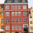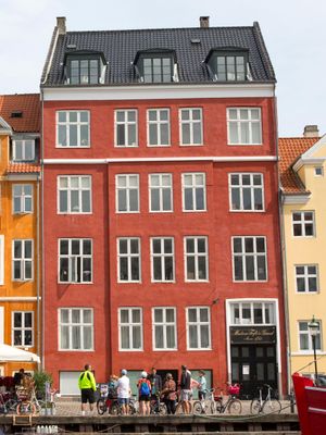 The red-painted building at Nyhavn 53 stands four stories tall with white-painted window frames along the waterfront canal of Copenhagen.