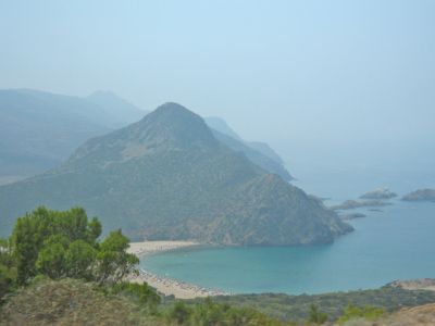 Madagh Beach is a sandy shore stretching along the Alboran Sea with deep blue waters in a bay ringed by rocky hills and scattered trees. The beach extends over several kilometers with a natural coastline relatively free from dense development.