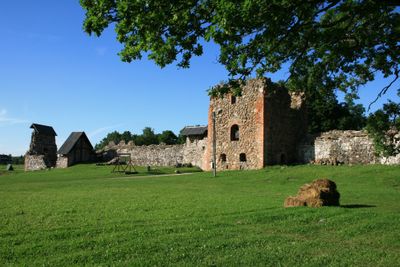 The remains of Karksi Castle include outer walls and two square towers built with rubble stone and brick construction techniques.