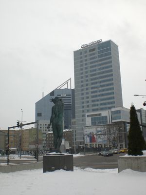 The metallic figure stands above the intersection of five main streets, marking the center of Tallinn's transportation network.