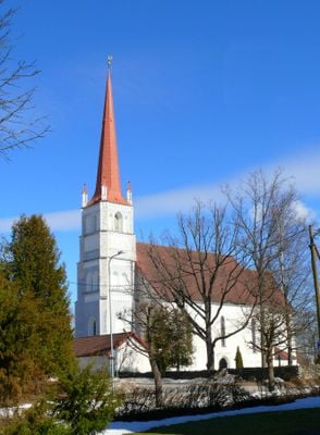 The church construction started in the 13th century, with a wooden tower added in 1741 and replaced by a stone tower between 1865 and 1867.