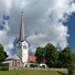 The stone building features traditional Estonian ecclesiastical architecture with rectangular windows and a tall spire rising above the main structure.