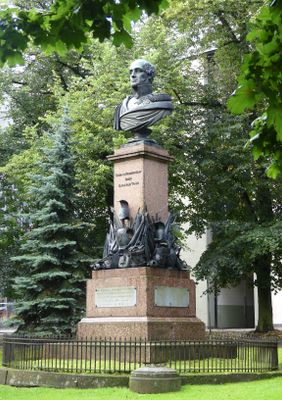The bronze monument features a formal military bust of Field Marshal Michael Andreas Barclay de Tolly mounted on a granite pedestal in Barclay Square.