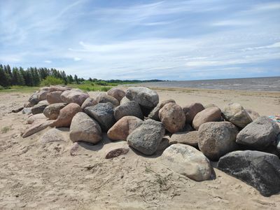 The sandy shores of Kabli Beach stretch along the Gulf of Riga, featuring coastal meadows and pine trees that border the waterfront.