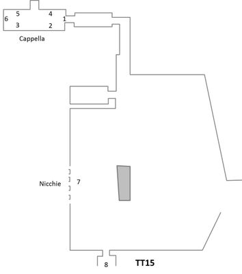 The tomb TT15 features chambers cut into bedrock accessed through a vertical shaft, with outer buildings constructed from mud brick materials.