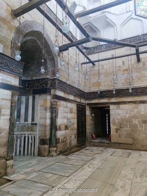 The mausoleum contains the oldest Egyptian prayer niche decorated with marble and features carved wooden Quranic friezes surrounding the burial chamber.