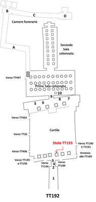 The TT192 tomb features a massive courtyard with 39 columns, leading to multiple chambers through descending corridors and decorated doorways.