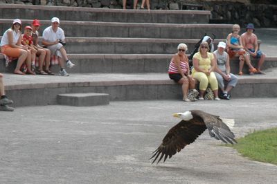 Daily flight demonstrations feature trained birds of prey performing hunting moves, with staff explaining their ecological role and interactions with their environment.