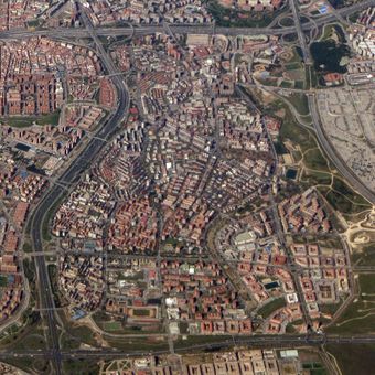 Moratalaz is a residential district in eastern Madrid with wide avenues and green spaces spread across several neighborhoods. The area is bordered by major transportation routes and connects different local communities within its boundaries.