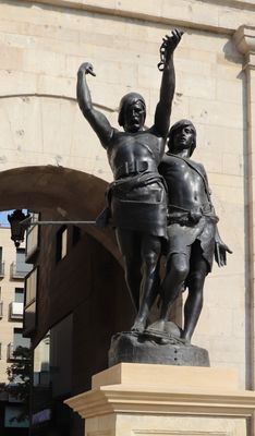 The bronze statue depicts two Iberian warriors, Indibil and Mandonius, carrying traditional weapons including chains, spears, and a distinctive Falcata sword.