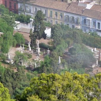 The English Cemetery in Málaga is a Protestant burial ground with a temple structure that includes an Anglican church surrounded by gardens and trees. The grounds contain numerous graves and monuments arranged throughout the planted landscape.
