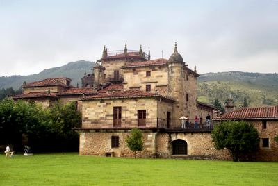 The Palacio de Elsedo features an octagonal tower and interconnected buildings with decorated archways and a grand entrance adorned with heraldic shields.