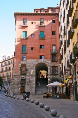 The Arco de Cuchilleros features high stone walls rising above steep stairs connecting Plaza Mayor with Cava de San Miguel street in central Madrid.