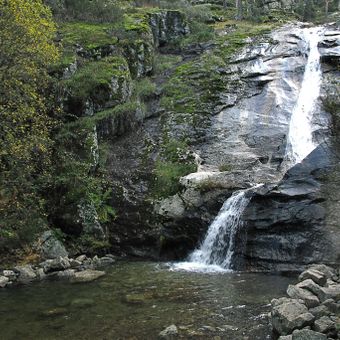 El Chorro de Navafría cascades down 20 meters through rocky cliffs within the Sierra de Guadarrama mountain range in Castilla y León.