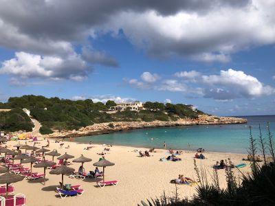 The beach maintains its traditional Mediterranean character with local restaurants serving fresh seafood caught by Felanitx fishing boats.