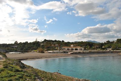 The beach stretches 70 meters in length and 110 meters in width, featuring fine white sand bordered by low rocky cliffs and Mediterranean vegetation.