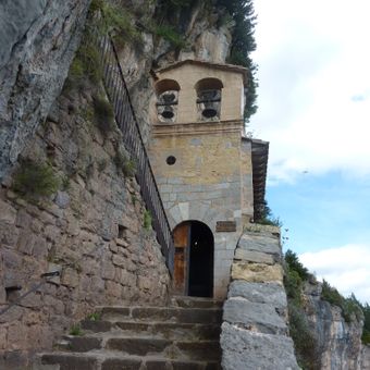 Santa Maria de Montgrony stands against bare rock cliffs of Sierra de Sant Pere at 1370 meters elevation, accessed by a stone staircase leading to Pla de Sant Pere.