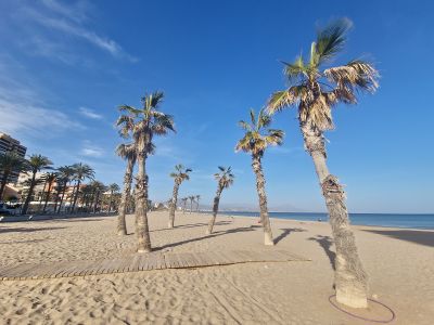 Playa de San Juan is a beach spanning over 3 kilometers of golden sand that stretches along the Mediterranean coastline in Alicante. A palm-lined promenade runs parallel to the shore, providing a paved walkway between the water and the city behind it.