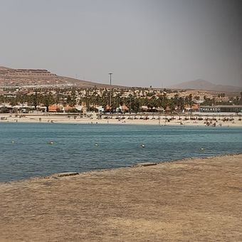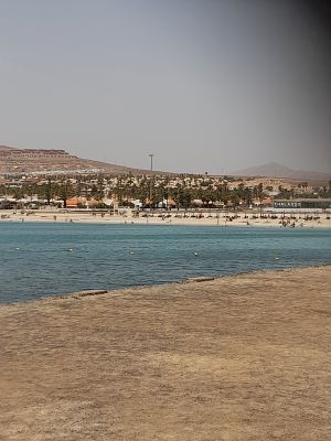 Playa de Furste extends for 700 meters along the eastern coast of Fuerteventura, featuring fine white sand and shallow, clear waters suited for swimming.