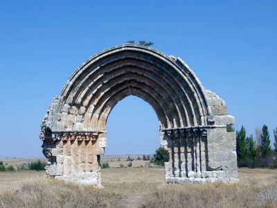 The arch represents the architectural heritage of medieval religious buildings in the Burgos province, now listed as an endangered monument.