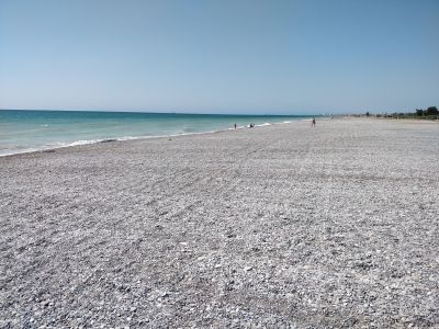 The 1200-meter-long beach stretches along the Mediterranean coast with a width of 28 meters, featuring smooth shingles and clear waters.