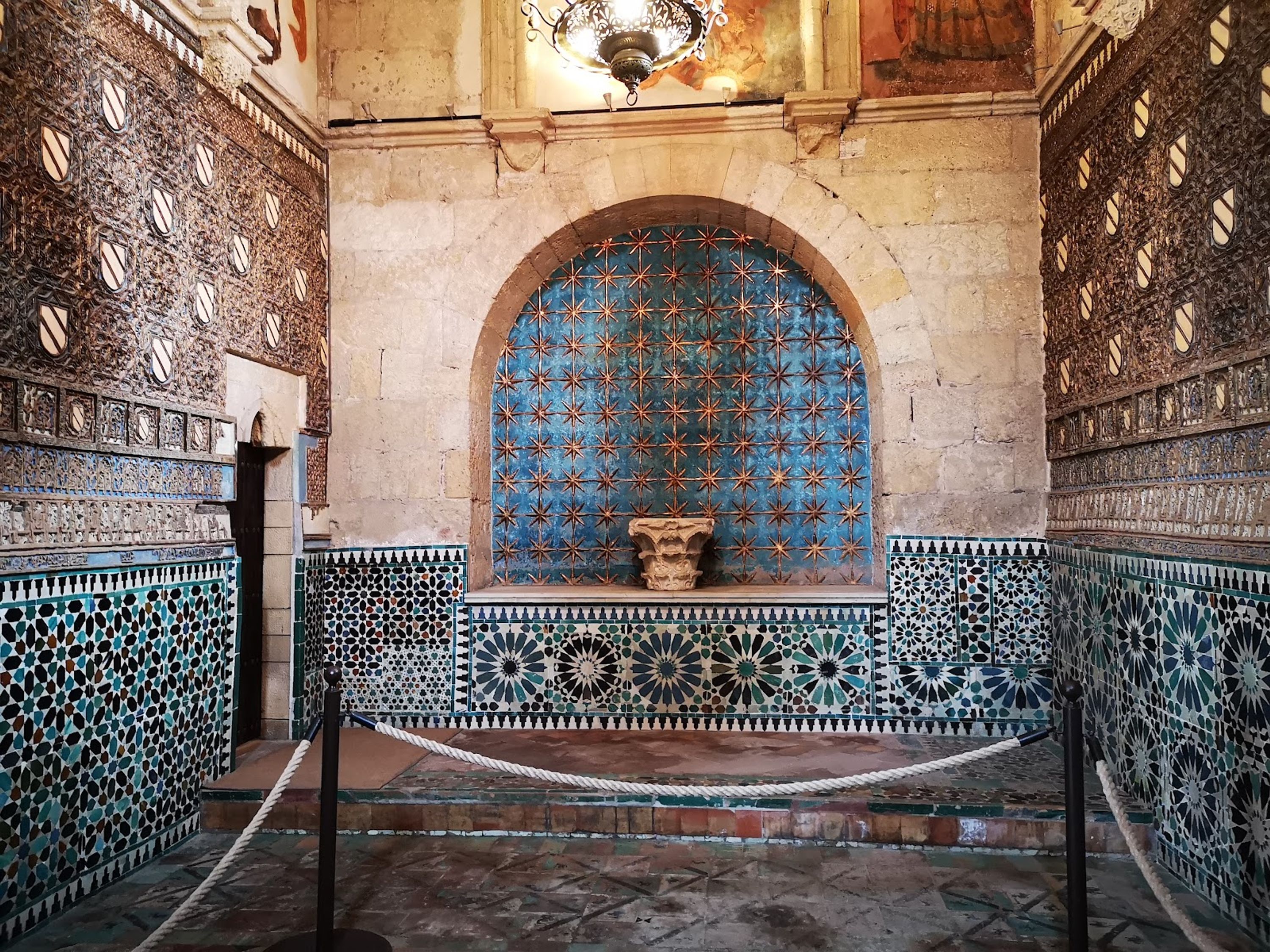 The interior walls display intricate plasterwork patterns combining vegetable, geometric, heraldic, and epigraphic elements in Mudéjar architectural style.