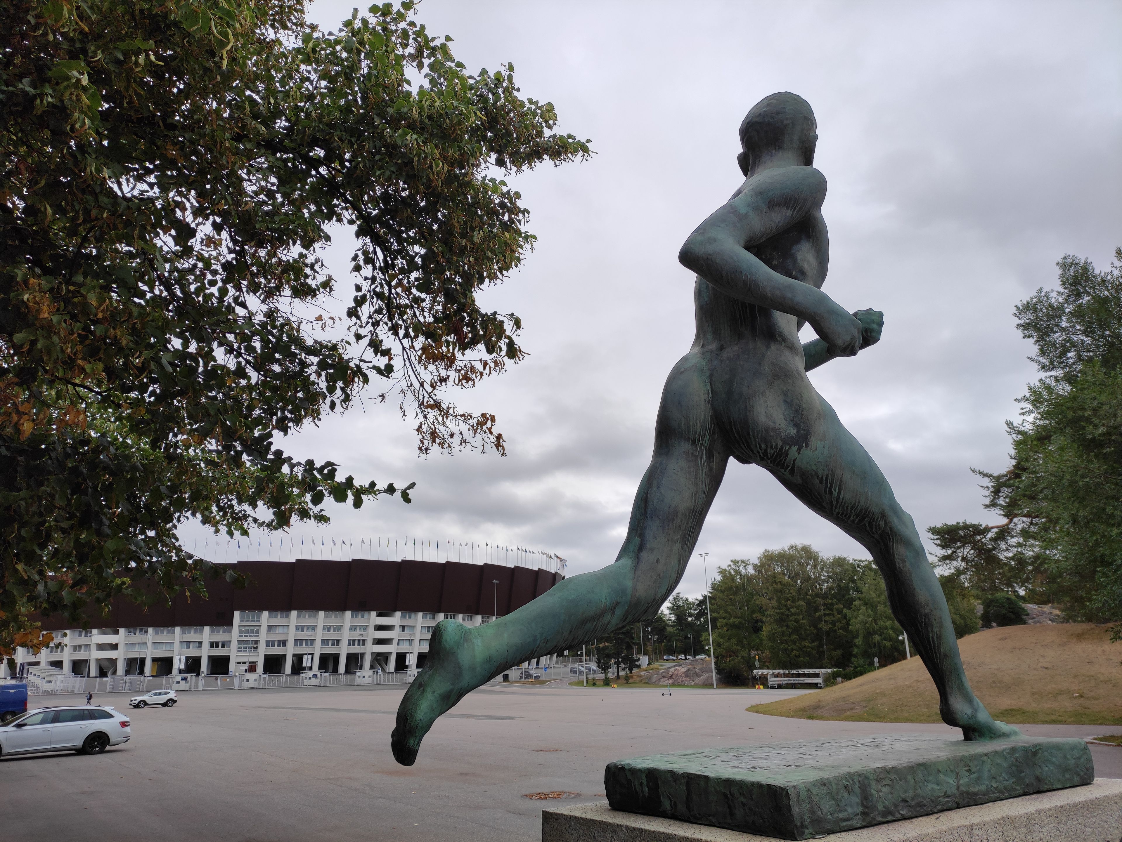 The statue depicts runner Paavo Nurmi in motion, with his weight distributed on the toes of his right foot in bronze form.