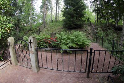 The memorial site features commemorative plaques and marks the location where 28 individuals were buried during the Finnish Civil War of 1918.