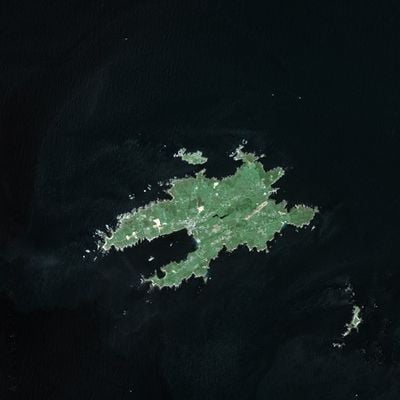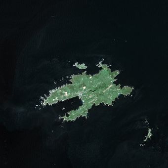 Ouessant sits off the western coast of Brittany in the Atlantic and stretches across a granite plateau with gentle hills and coastal cliffs. The island shows open heathland, narrow lanes between low stone walls, and several small hamlets clustered around the main village of Lampaul.