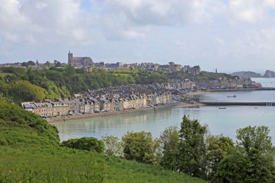 Cancale stretches along the northern coast of Brittany, divided between an upper town section and a harbor area called La Houle connected by cobblestone streets.