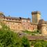 Château de Castelnau-Bretenoux rises from a rocky hill with red stone walls forming a triangular layout and nine round towers at strategic points.