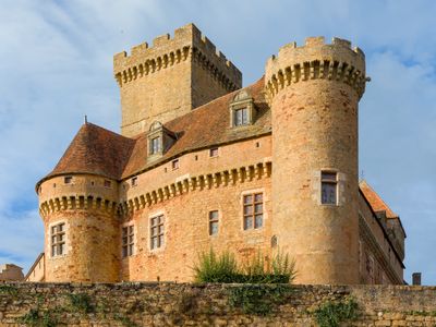 The castle features multiple levels with staircases, including 60 steps to reach the artillery tower terrace that provides views across the Dordogne Valley.