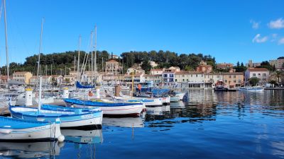 Saint-Mandrier-sur-Mer is a coastal commune stretching along the Mediterranean near Toulon's naval port, with multiple beaches and sheltered waters. The area connects to the mainland through a causeway built centuries ago, forming a connected peninsula.