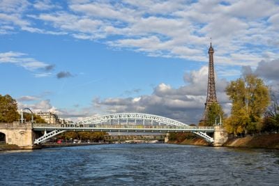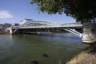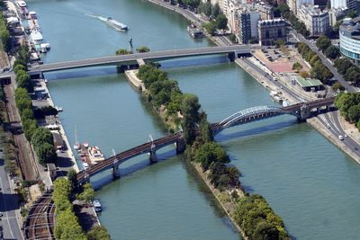 The Pont Rouelle spans across the Seine River, connecting the 15th and 16th arrondissements while passing through the Île aux Cygnes island.