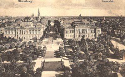 The square features five monumental buildings, including the Palais du Rhin, the National Library, and the Theatre National, forming a grand architectural ensemble.