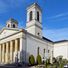 The Saint-Louis Church displays symmetrical architecture with columns, a central dome, and multiple stained glass windows adorning its stone facade.