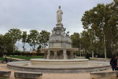 The fountain displays five sculptures at its corners depicting Navigation, Strength, Commerce, History, and Geography through cherub figures.