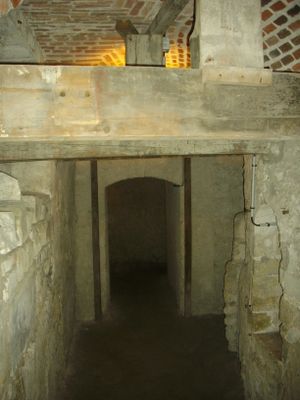 The underground crypt features two distinct chambers connected by openings in a thick wall, with ribbed vaults characterizing the architectural style.