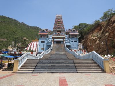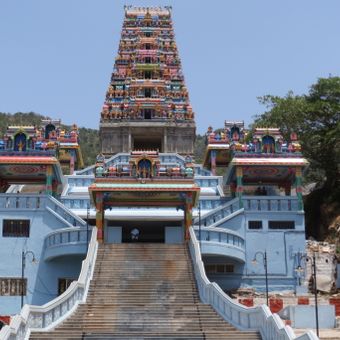 The temple stands atop a 600-foot granite hill, featuring a main shrine dedicated to Lord Murugan with black granite sculptures and traditional Tamil architecture.
