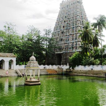 The Mayuranathaswami Temple is a Hindu shrine with multiple entrance towers and thick surrounding walls that enclose various shrines within its grounds. The structure displays the tiered tower design typical of South Indian temples, with the eastern gateway serving as the main entry point.