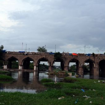 The bridge extends 600 feet across the Musi River with 22 stone arches and measures 35 feet wide at 54 feet above water level.