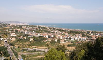 The town extends along the Adriatic Sea with a coastline featuring numerous beach establishments and a promenade connecting residential neighborhoods to the waterfront.