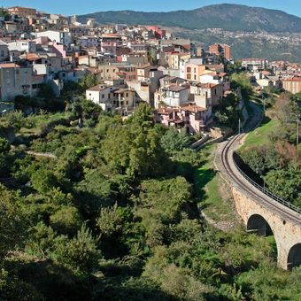 Lanusei is a mountain town in central-eastern Sardinia situated at roughly 595 meters elevation with Mediterranean-style buildings scattered across its hillside. The buildings and streets follow the natural slope of the terrain.